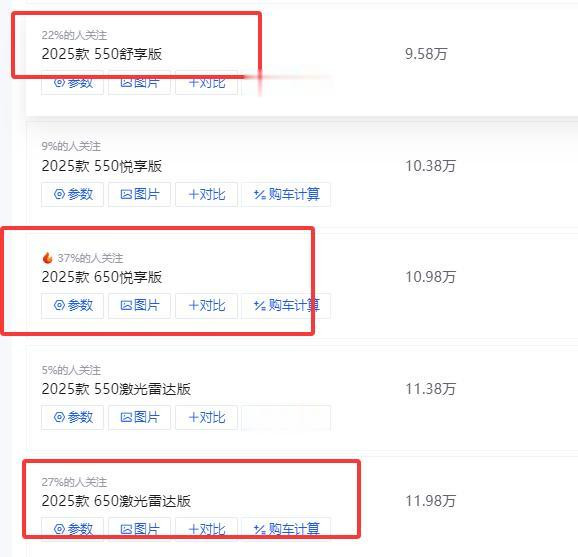 关注热度最高的就是两款650公里续航版,650公里激光雷达版,相比较于普通版本650km(悦享版)来说,在价格上高了一万,但多了24项配置。包括自适应远近光、车载智能芯片,高通骁龙8295芯片、后方碰撞预警,倒车车侧预警、激光雷达、毫米波3个雷达等等,配置上确实也是比较不错。